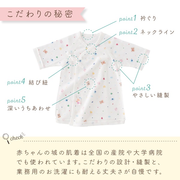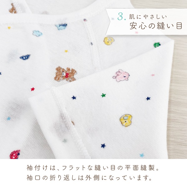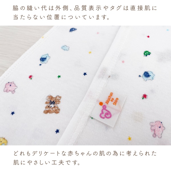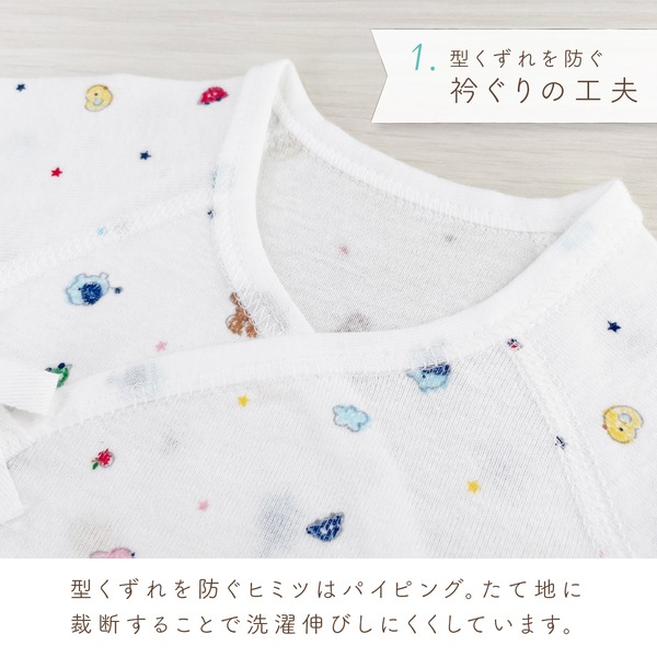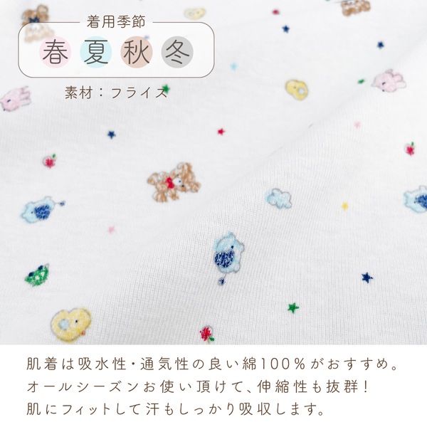 オールシーズンお使い頂けるフライス素材は、伸縮性に優れ肌にフィットして汗をしっかり吸収します。 デリケートな赤ちゃんの肌に刺激を与えないように縫い目は平面縫製を採用。 型くずれしにくい衿のパイピングやほつれないひも先など、ベビー用品専門メーカのこだわりが詰まった肌着です。 ☆着用時期の目安(春・夏・秋・冬)