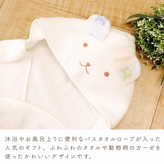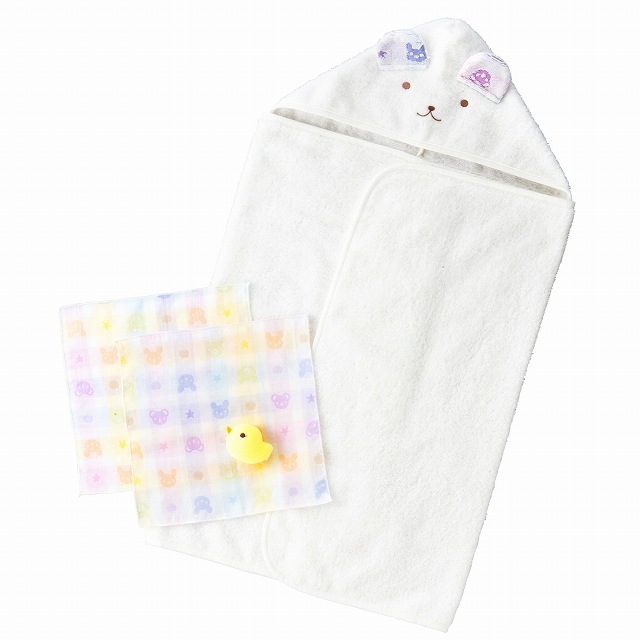| バスタオルローブ(約58×100cm※フード除く)・ハンカチ(2枚)・ガラガラ |