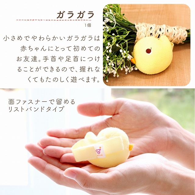 | 沐浴やお風呂上りに便利なバスタオルローブが入った実用的で喜ばれるギフトです。 【バスタオルローブ】綿100%のふんわりと柔らかいフード付きのバスタオル。お風呂上がりの赤ちゃんをくるっと巻いてさっと拭き上げることができる便利なアイテムです。沐浴はもちろん、大きくなっても海やプールなどでもお使いいただけるので、プレゼントとして人気があります。 【ガーゼハンカチ】沐浴の際に、授乳の時に、お食事の時にさっと使えるガーゼハンカチです。二重ガーゼを使用しているので、使うほどに柔らかくなります 【ガラガラ】かわいい鈴の音が鳴るひよこのガラガラ。手首に付けて遊べるので、握れなくても、新生児から楽しく遊べます。 |