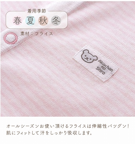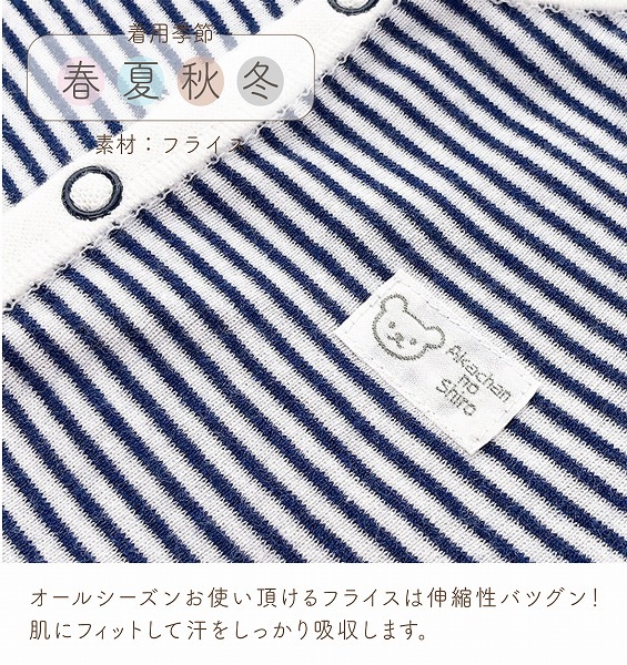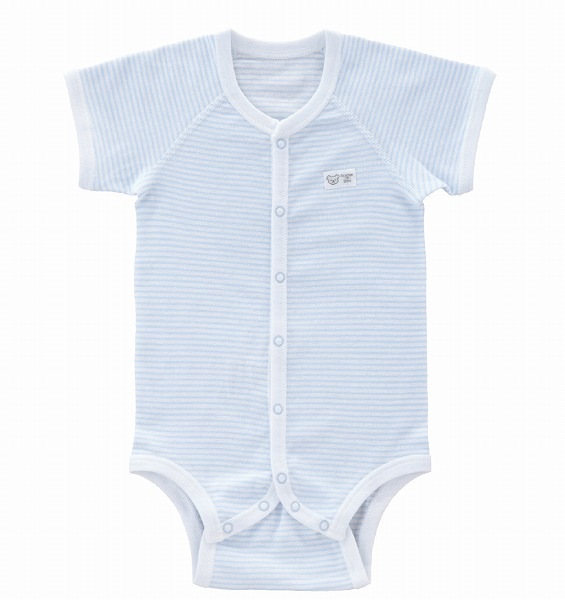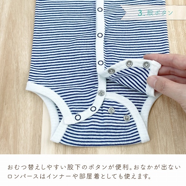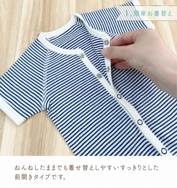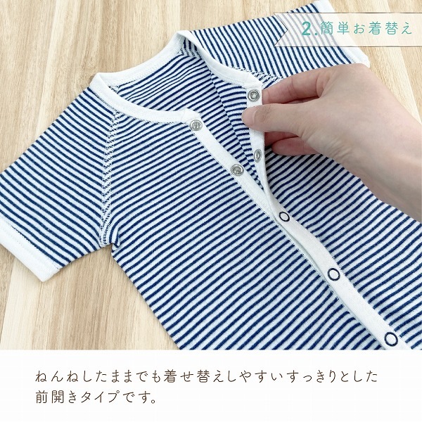 前ボタンタイプで、股下まで全開できるのでお着替えやオムツ替えも簡単です。