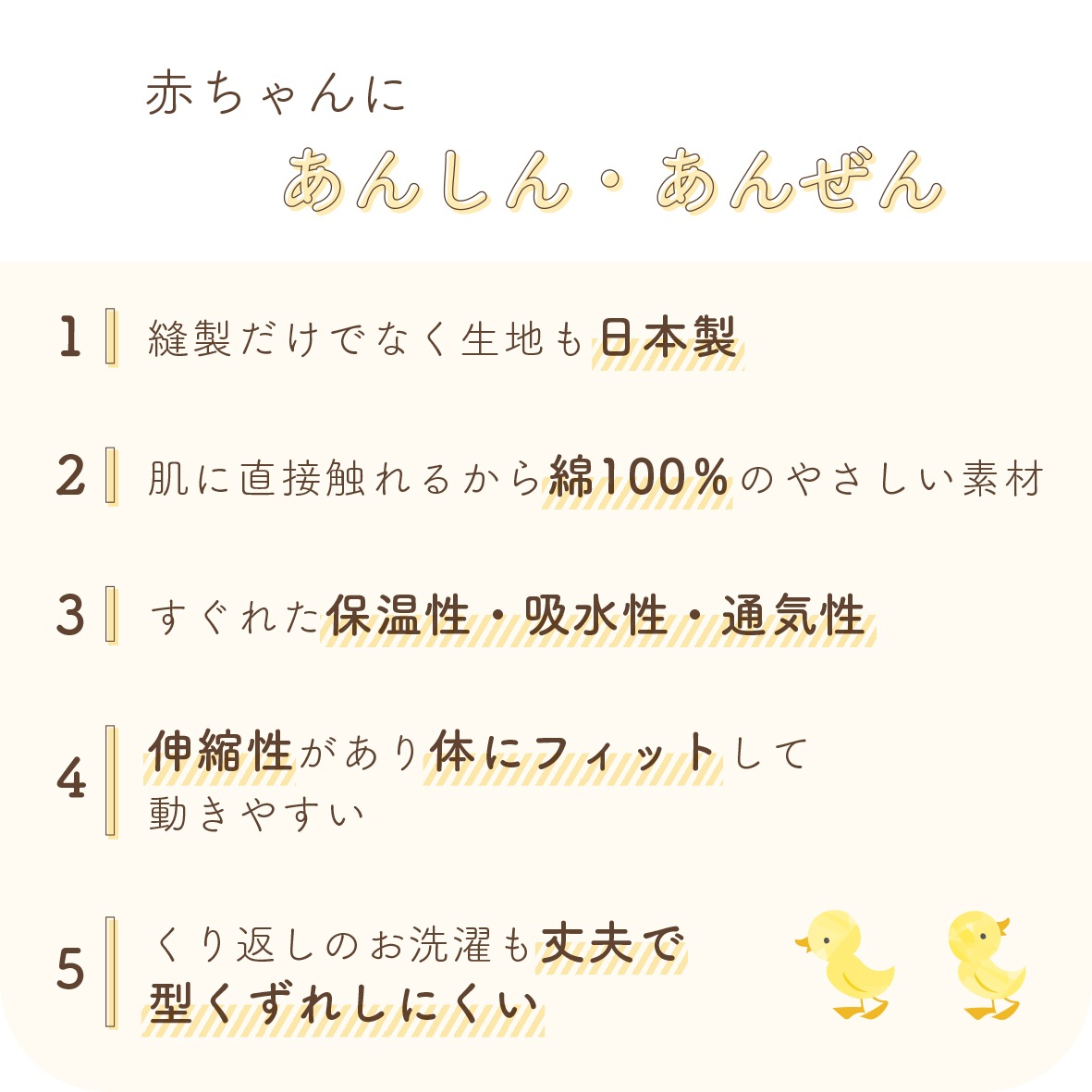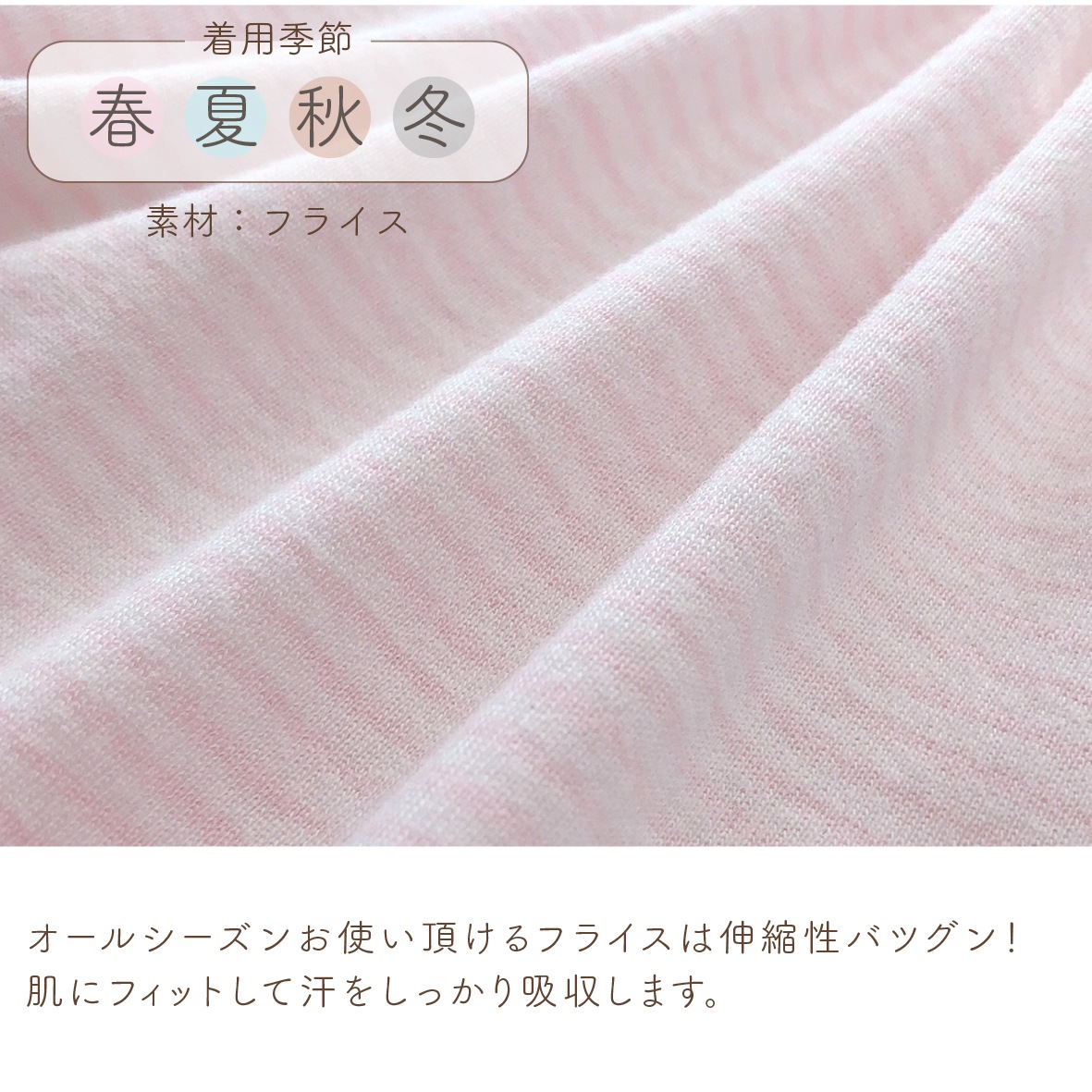 | 首がすわった後は、上からすっぽりかぶれる「かぶりタイプ」の肌着がとっても便利!抱っこしても、元気にハイハイしてもお腹が出る心配のないロンパース型の肌着です。伸縮性に優れたフィット感抜群のフライス素材を使用。汗をしっかり吸収し、オールシーズン快適です。肌着としてはもちろん、お部屋着としても大活躍の人気アイテムです。 【フライス編み】高い伸縮性で着心地抜群! 横方向によく伸びるので肌にフィットして見えない汗も良く吸収します。 ☆着用時期の目安(春・夏・秋・冬) |