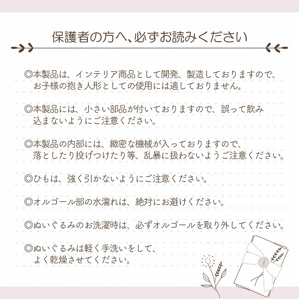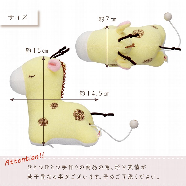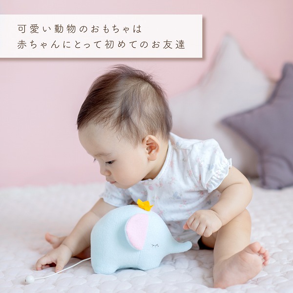 赤ちゃんがおすわりやハイハイを始める頃は行動力や集中力が発達する時期です。両手で物を握ったり、左右の手で持ち替えたり。赤ちゃんの成長に合わせて興味に応える知育玩具シリーズ。綿入りのやわらかなパイル素材だから安心です。 保護者の方へ、必ずお読みください。 ◎本製品は、インテリア商品として開発、製造しておりますので、お子様の抱き人形としての使用には適しておりません。 ◎本製品には、小さい部品が付いておりますので、誤って飲み込まないようにご注意ください。 ◎本製品の内部には、緻密な機械が入っておりますので、落としたり投げつけたり等、乱暴に扱わないようご注意ください。 ◎ひもは、強く引かないようにご注意ください。 ◎オルゴール部の水濡れは、絶対にお避けください。 ◎ぬいぐるみのお洗濯時は、必ずオルゴールを取り外してください。 ◎ぬいぐるみは軽く手洗いをして、よく乾燥させてください。 |