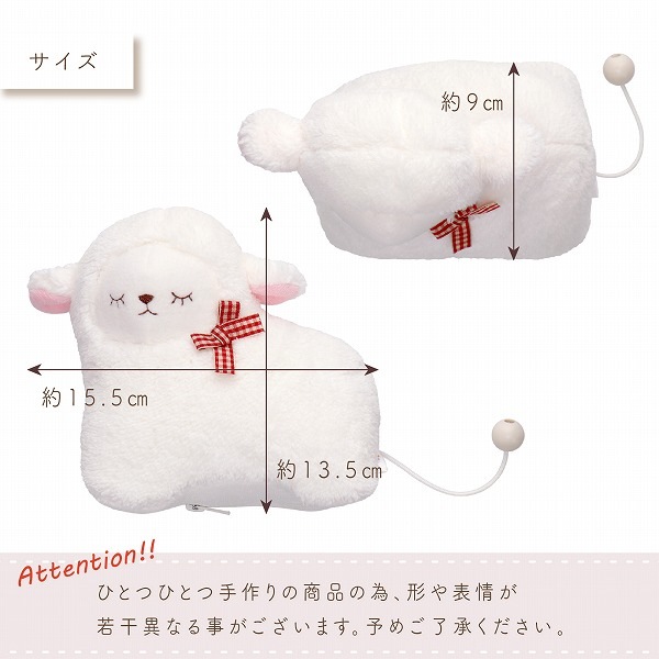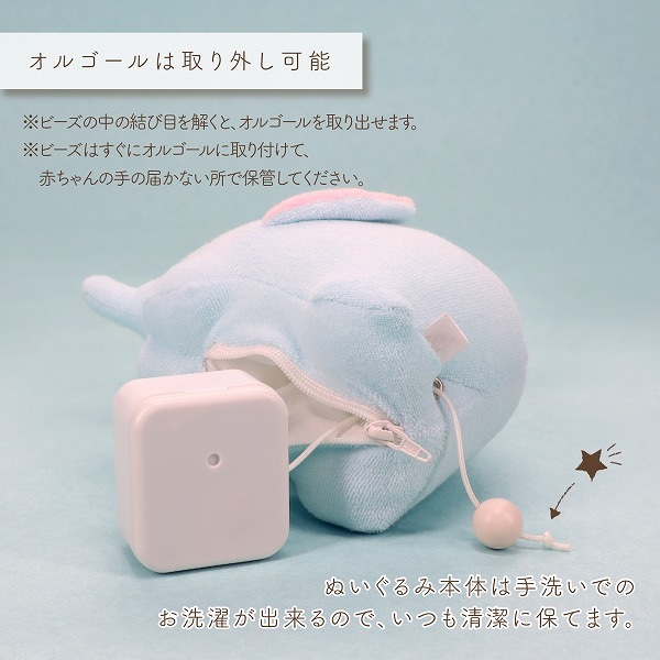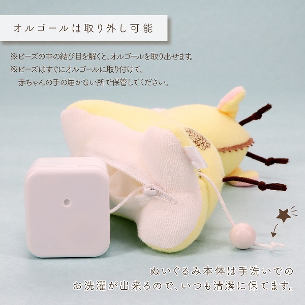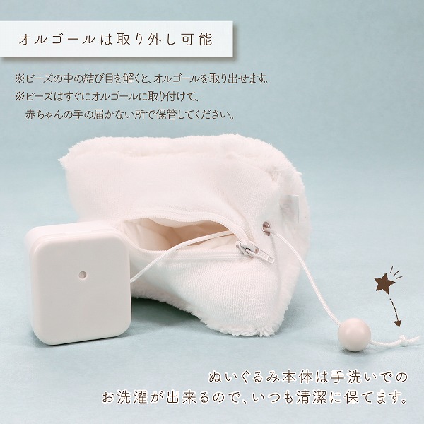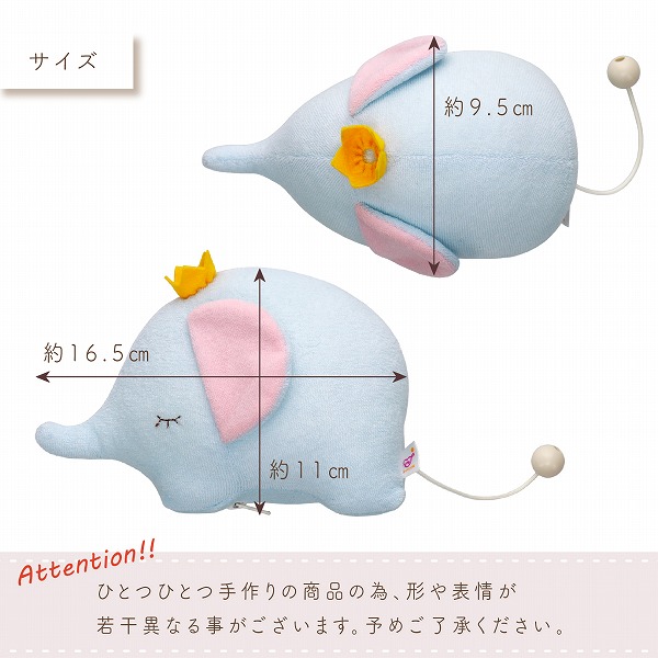 【ぞうさん・きりんさん】 本体:パイル(綿75% ポリエステル25%) オルゴール部:ABS(耐熱70℃) 【ひつじさん】 本体:ボア(ポリエステル100%) オルゴール部:ABS(耐熱70℃) |