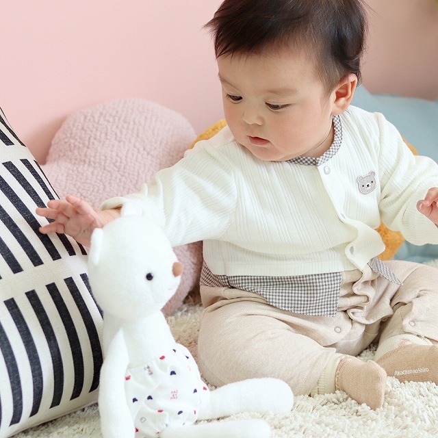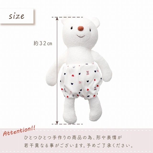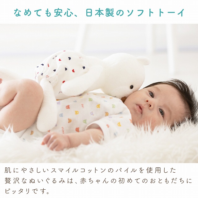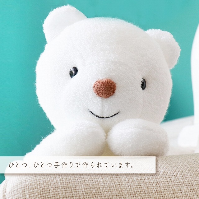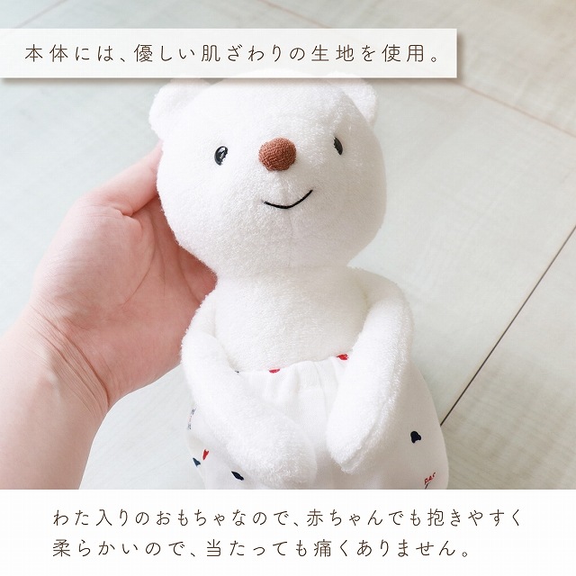 スマイルコットンを使用した柔らかい肌触りのくまのぬいぐるみです。赤ちゃんの初めてのお友達に。 【スマイルコットン】 やわらかさの秘密は生地の製造過程。一度撚った糸ををほぐし、糸そのものを「わた」に戻すことで、ふんわりと軽い使い心地が続きます。その肌触りは敏感肌の方々にも喜ばれており、一般的な綿素材と比べて蒸散性が高く、乾きやすい素材です。感動的な肌触りで多くの方にリピートいただいています。 |