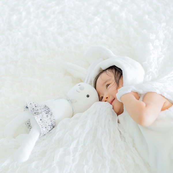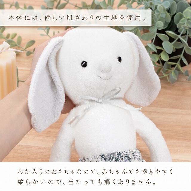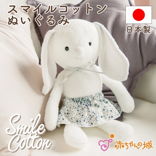 スマイルコットンを使用した柔らかい肌触りのうさぎのぬいぐるみです。赤ちゃんの初めてのお友達に。 【スマイルコットン】 やわらかさの秘密は生地の製造過程。一度撚った糸ををほぐし、糸そのものを「わた」に戻すことで、ふんわりと軽い使い心地が続きます。その肌触りは敏感肌の方々にも喜ばれており、一般的な綿素材と比べて蒸散性が高く、乾きやすい素材です。感動的な肌触りで多くの方にリピートいただいています。 |