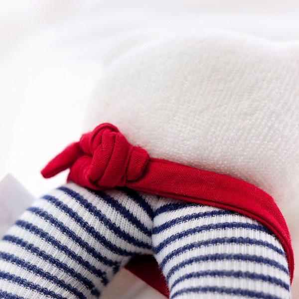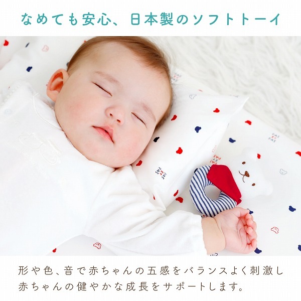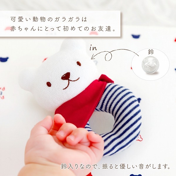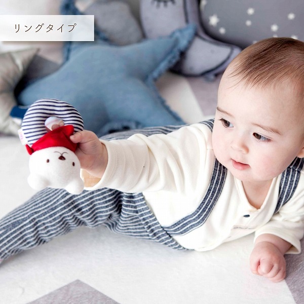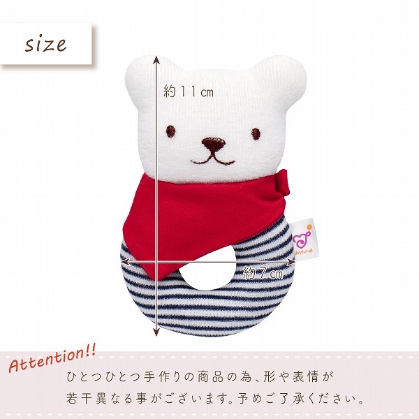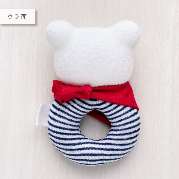 振ると鈴の音がするやわらかい布製のガラガラです。お洗濯は軽く手洗いをして、よく乾燥をさせてください。 安全の為、破損変形している場合は使用しないで下さい。