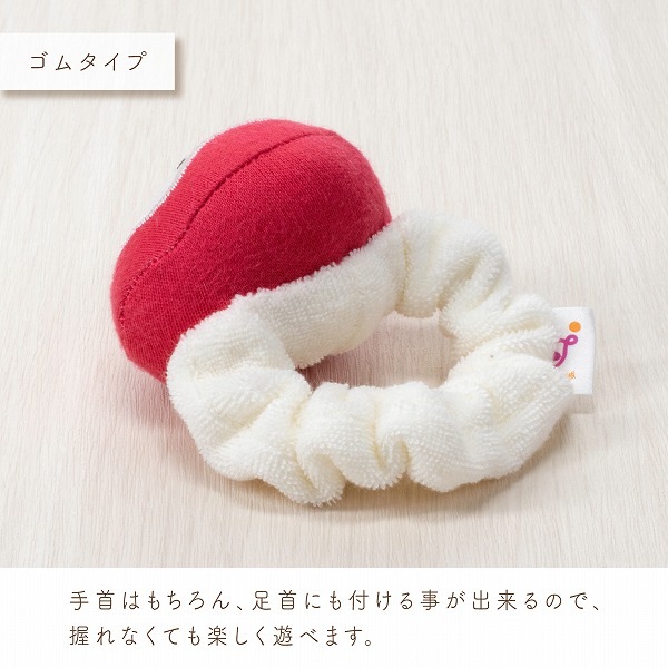 赤ちゃんの手首や足首につけるガラガラです。 まだおもちゃが握れない赤ちゃんでも、 つけて振ると鈴の音がなり遊べます。お洗濯は軽く手洗いをして、よく乾燥をさせてください。 安全の為、破損変形している場合は使用しないで下さい。