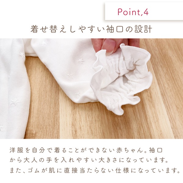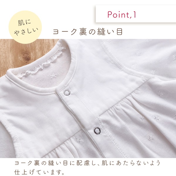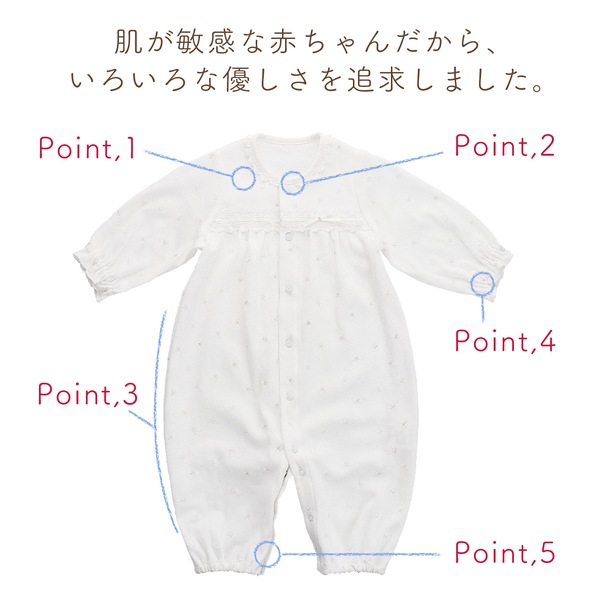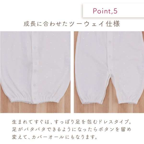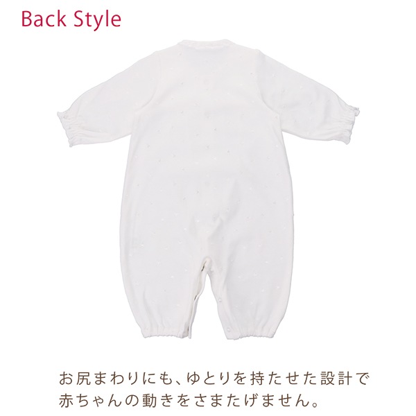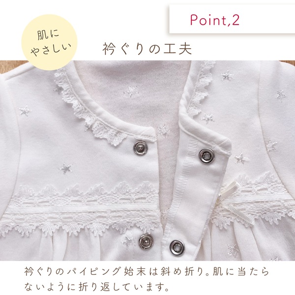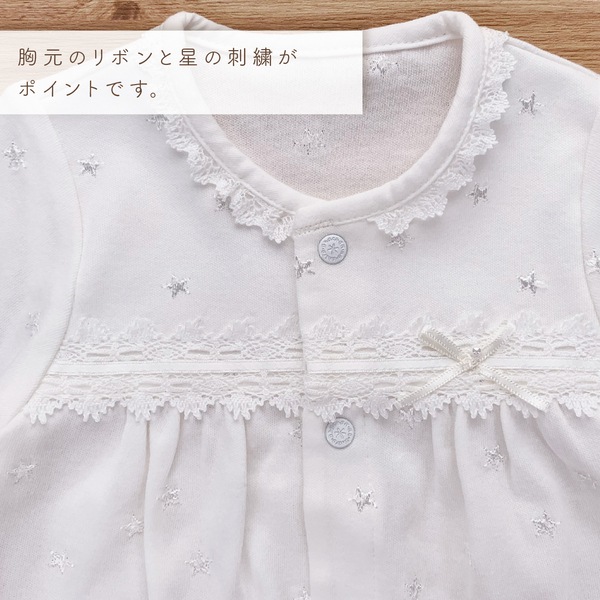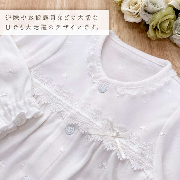 | 繊細な刺繍が全体に入った生地に美しいレースが付いた豪華なドレスです。肌触りの良いスムース素材で、秋から春先まで活躍します。 生まれてすぐは足を包むドレスタイプ。足をばたばた出来るようになったらボタンを留め替えて、カバーオールタイプにもなるツーウェイ仕様です。胸元の美しいデザインは写真映えも良く、イベント事やお披露目にも最適です。出産準備はもちろん、ギフトにもおすすめです。 【お手入れ方法】 型崩れしないように洗濯ネットに入れて洗濯機で洗ってください。 直接肌に触れるものなので、蛍光増白剤が入ってない洗剤をお勧めします。 柔らかい素材を使用していますので、形を整えて干してください。 |
