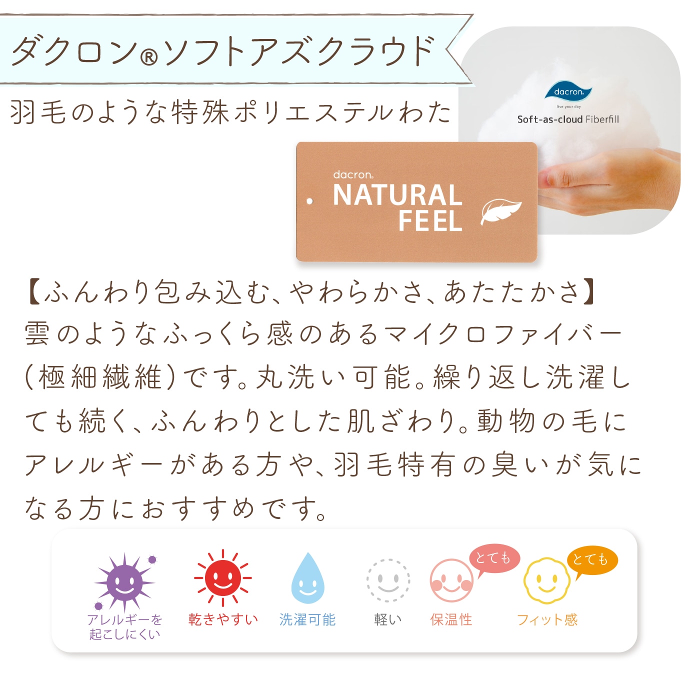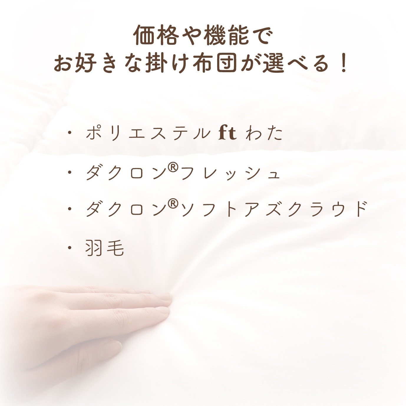●綿100%(綿ブロード) ●掛布団中綿: ポリエステル、フレッシュ、ソフトアズクラウド:ポリエステル100%/ 羽毛:ダウン90%・フェザー10% ●敷芯:エコホールサンドマット ●枕:中身 発泡ポリスチレン ●ピッタシーツ:綿100% |