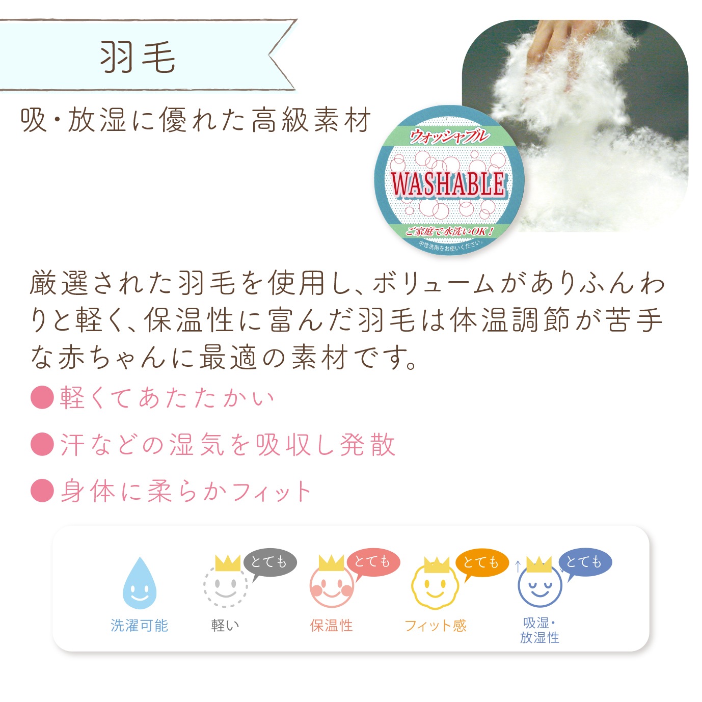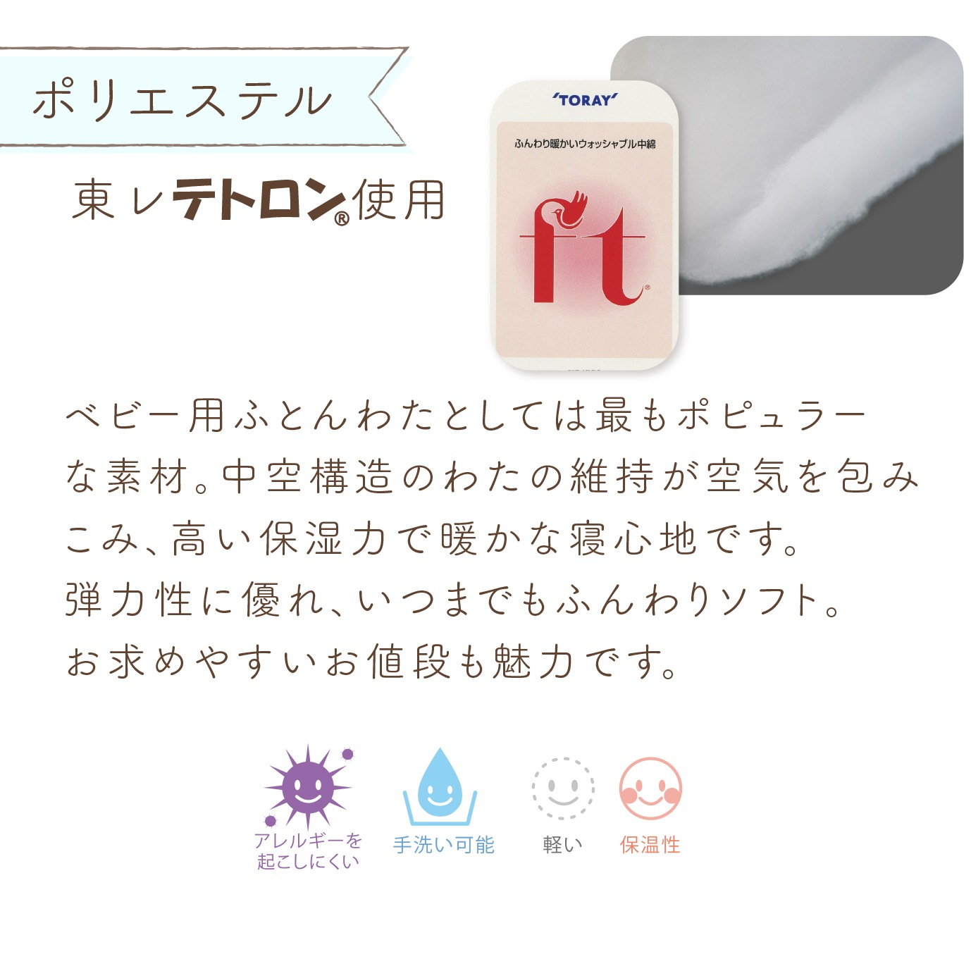 | 肌に触れる素材や縫製にこだわり、いつも清潔・快適にお使いいただける日本製のお布団セットです。お布団のサイズと掛布団の中わたをお選びいただけるカスタマイズ布団です。おもちゃの柄がかわいいロングセラーのデザインです。 【掛布団中綿】 ポリエステル:軽くて保温性に優れ、ベビー用ふとんわたとしても最もポピュラーな素材のポリエステル綿です。 フレッシュ:繊維1本1本の中に7つの空気孔を持っており、その中にたくさんの空気を含むことでふんわりあたたかい特徴の綿です。 ソフトアズクラウド:雲のようなふっくら感があり、羽毛のような特殊ポリエステル綿です。 羽毛:ボリュームがあり、ふんわりと軽く保温性に富んだ素材です。放・吸湿性に優れているので、体温調節機能が未発達の赤ちゃんに最適です。 【敷布団】赤ちゃんの為の最高の敷布団、エコホールサンドマット(高機能三層構造)。通気性に優れ、大人以上に汗をかく赤ちゃんも快適に眠ることが出来ます。また適度な固さで背骨もしっかり支えます。 【お手入れ方法】 ・掛カバーリング 綿素材は合成洗剤で洗えますが、生成や淡色のものは蛍光増白剤の入っていない洗剤で洗ってください。 プリントものは濡れたままの状態で放置すると、色移りの原因になりますので、脱水後は出来るだけ早く形を整えて干してください。(約30分) 洗濯するときは必ずファスナーを閉じてください。 ・掛布団中綿(ポリエステルわた) 押し洗い程度にして、中わたが片寄らないようにしてください。 脱水を十分にし、天日干しをして、よく乾燥をしたことを確認のうえ、中わたをよくほぐして取り込んでください。 長時間天日干しをした場合は、結露の原因になりますので、風通しの良いところに干して、湿気を除去してからお使いになるか収納してください。 ・掛布団中綿(フレッシュ/ソフトアズクラウド) 洗濯機をご使用の場合は、「大物コースまたは布団コース」に設定し縦に二つ折りにして、端から円柱状に丸めて単体で洗って下さい。 充分すすいだ後、よく脱水して下さい。 ・掛布団中綿(羽毛) 洗濯機をご使用の場合は、「大物コースまたは布団コース」に設定し30℃以下の水で、中性洗剤で洗って下さい。充分すすいだ後、よく脱水して下さい。中まできちんと乾かない場合もあるので、その時は2日にわたって干すようにしましょう。 取り込んだ後、風通しの良い場所で2〜3時間干し、軽く叩いて詰め物の片寄りを直して下さい。 (乾燥が不十分ですと異臭の原因になります) ・敷布団の側 洗濯後の縮みにより中身が装着しにくくなりますので、できるだけ洗われないようにしてください。 どうしても水洗いが必要な時は、ファスナーを閉じて洗濯ネットに入れ、他の洗濯物にからまないようにして洗ってください。 洗濯後若干の縮みがありますので、中身を入れるときに多少の力が必要になります。 干す前にたて、よこ方向ともよく伸ばしておくと縮みが少なくなります。 ・敷布団の中身 敷きふとんの中身は、通気マットの材料であるパームの繊維が折れますので、洗濯はお避け下さい。 できるだけキルトパッド、防水シーツを敷いて、中身が汚れないようにご使用ください。 もし、汚れた場合はその部分だけタオルなどに水を含ませ汚れを吸い取ってください。 ・シーツ シーツにゴムが入っているので、洗濯槽から取り出すときに他の洗濯物と絡み、ゴムが伸びきってしまう恐れがありますので、洗濯ネットに入れて洗ってください。 |