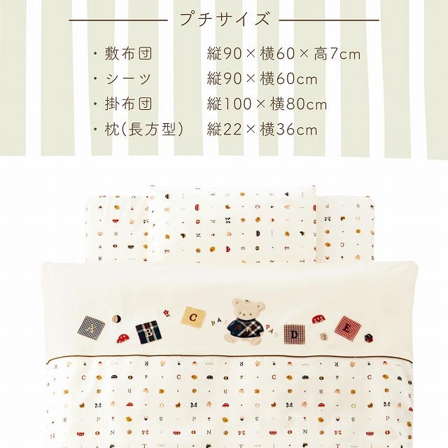 | 【レギュラーサイズ】 ●掛カバーリング:約縦125×横100cm ●掛布団中綿:約縦125×横100cm ●敷布団:約縦120×横70×高7cm ●枕:約縦22×横36cm ●ピッタシーツ:約縦120×横70cm 【ミニサイズ】 ●掛カバーリング:約縦100×横80cm ●掛布団中綿:約縦100×横80cm ●敷布団:約縦90×横60×高7cm ●枕:約縦22×横36cm ●ピッタシーツ:約縦90×横60cm |