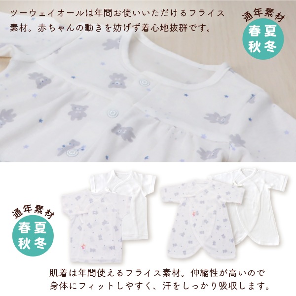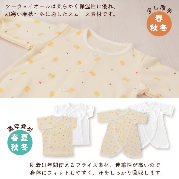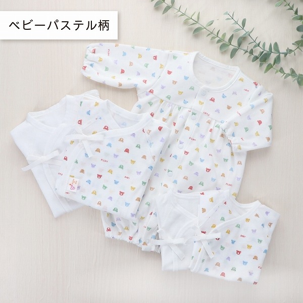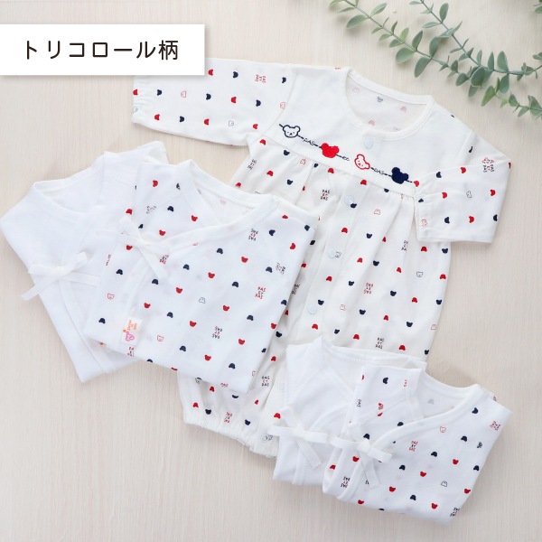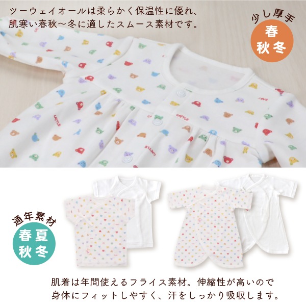 | ●ツーウェイオール1枚 綿100%(スムースまたはフライス) ●コンビ肌着2枚(無地、トリコロール):綿100%(フライス) ●短肌着2枚(無地、トリコロール):綿100%(フライス) |