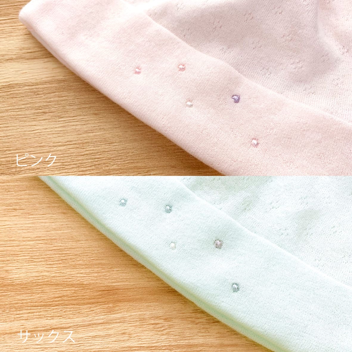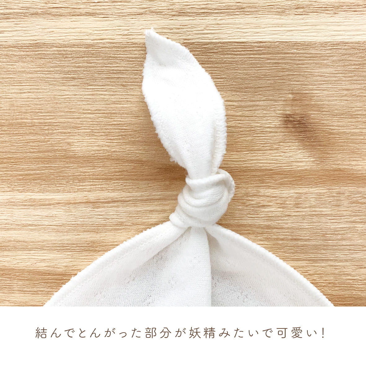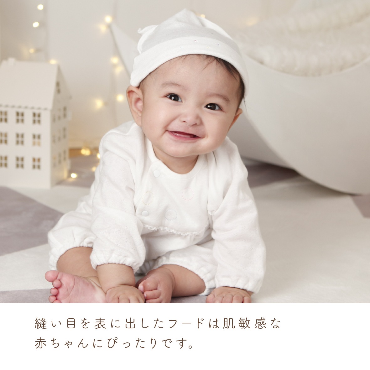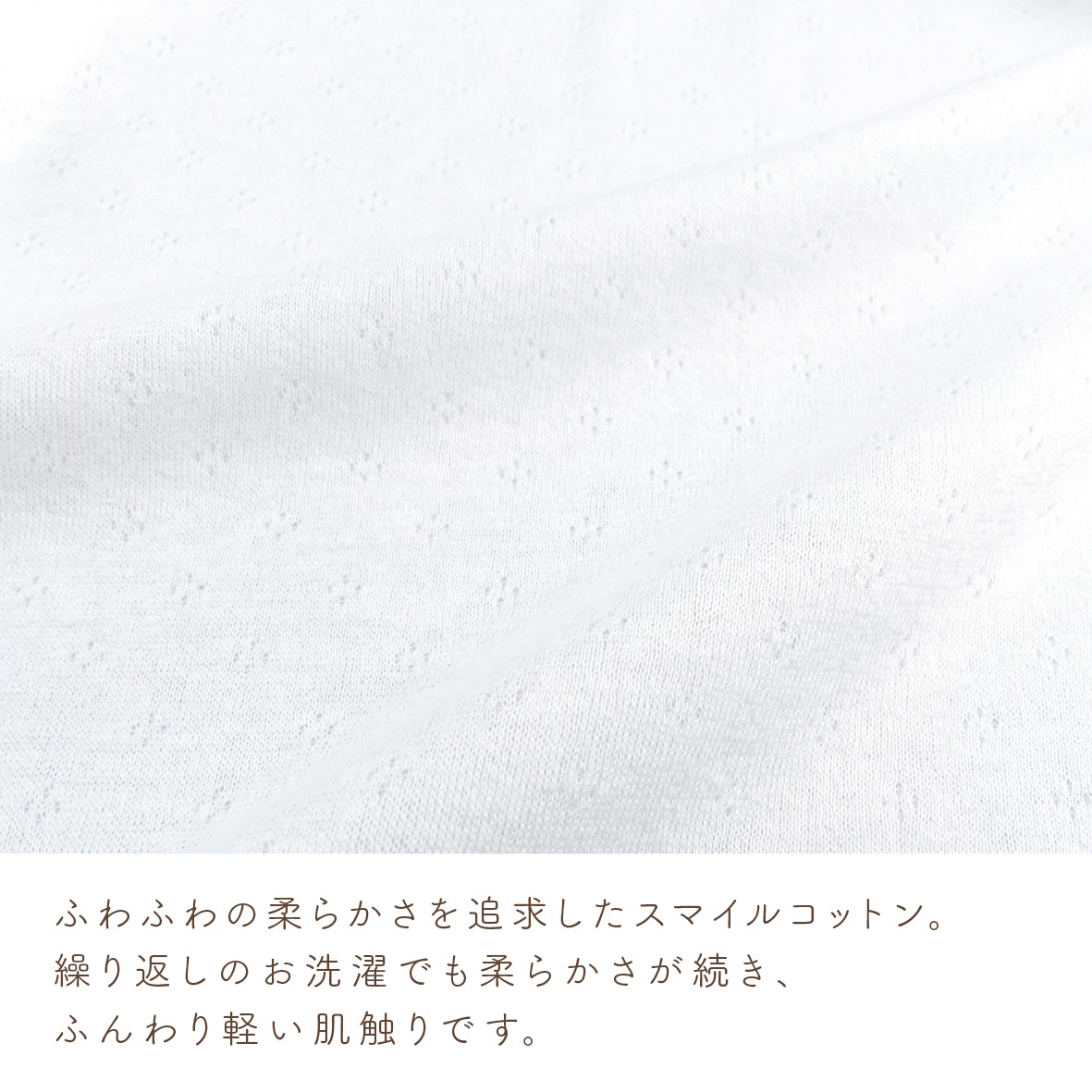 | 洗っても硬くならず、軽くてふわふわのやわらかさを追求したスマイルコットンを使用。縫い目を表にすることで、デリケートな肌への刺激を最小限にした、赤ちゃんにやさしい縫製です。