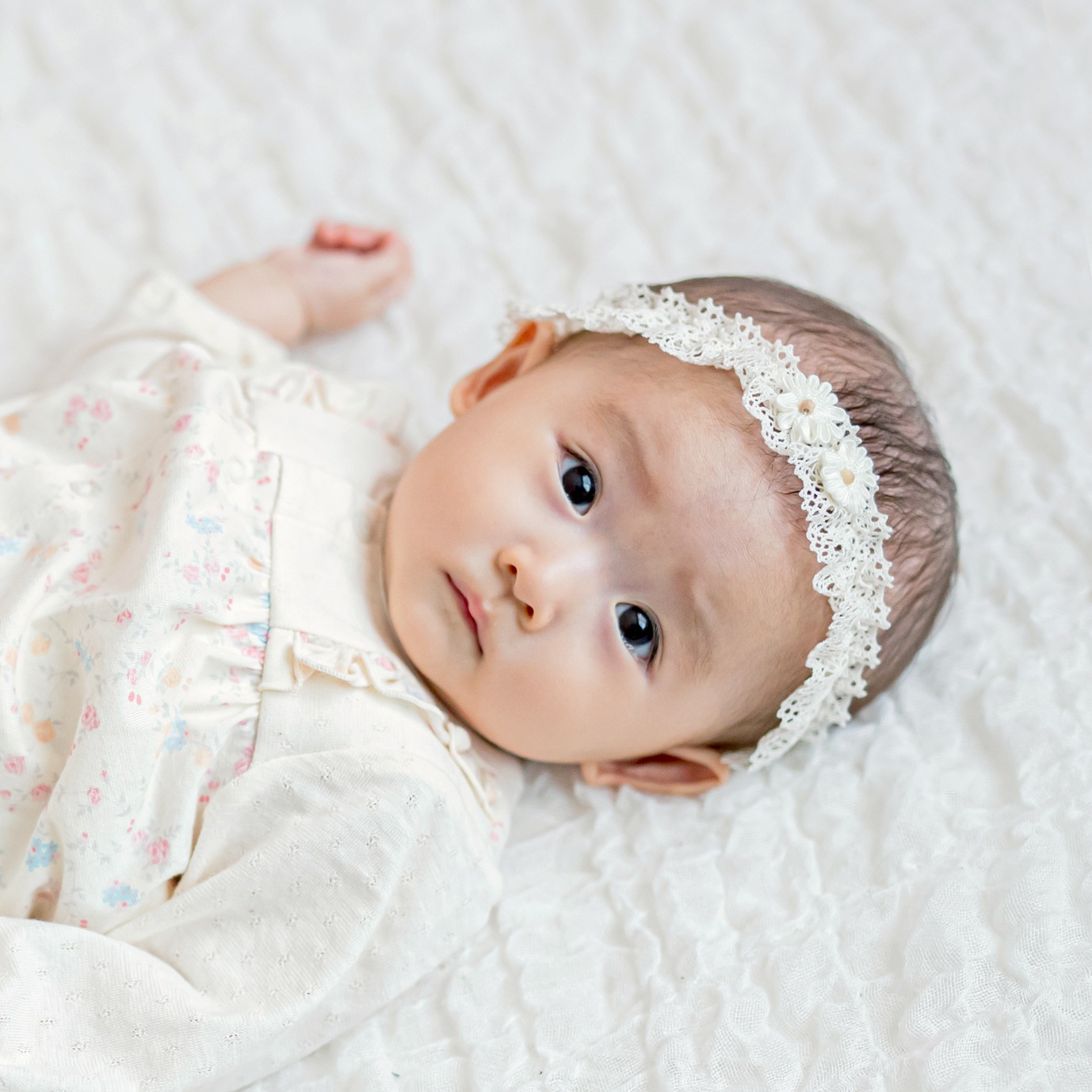 華やかなレースや飾りが付いたヘアバンドです。伸縮性のあるレースを使用しているので、頭にやさしくフィットします。可憐で美しいレースが、女の子らしさを演出。ご退院やお披露目はもちろん、普段使いにも活躍するアイテムです。