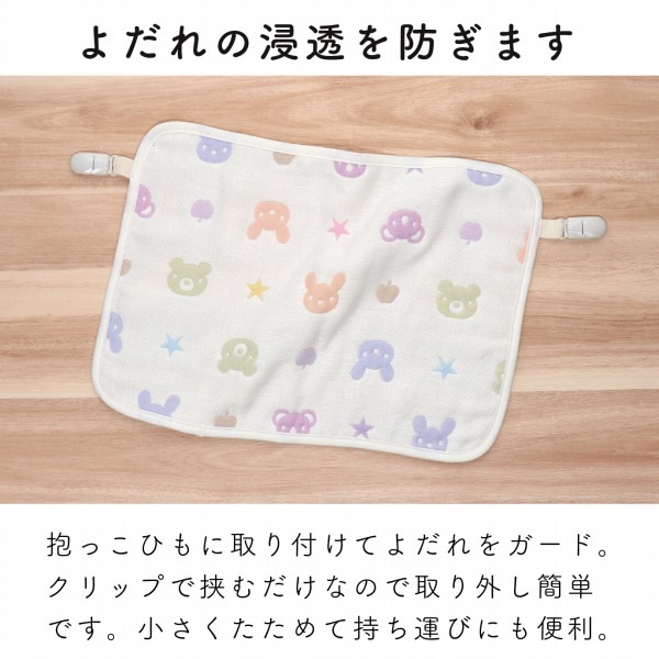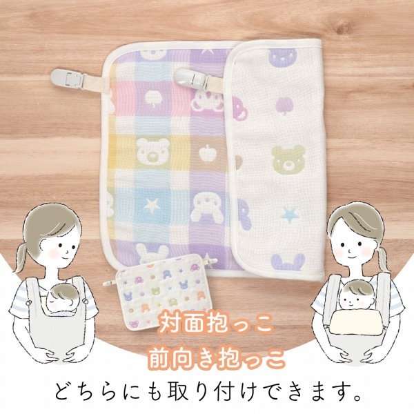 | パステルチェックと動物柄が可愛い、人気のデザインです。抱っこひもにクリップで取り付けます。ボリュームのある六重ガーゼでよだれをしっかり吸収。前向き抱っこの時も対面抱っこの時も、取り付けが出来るので、ママ・パパのお洋服や抱っこひもをよだれからガードします。 |
