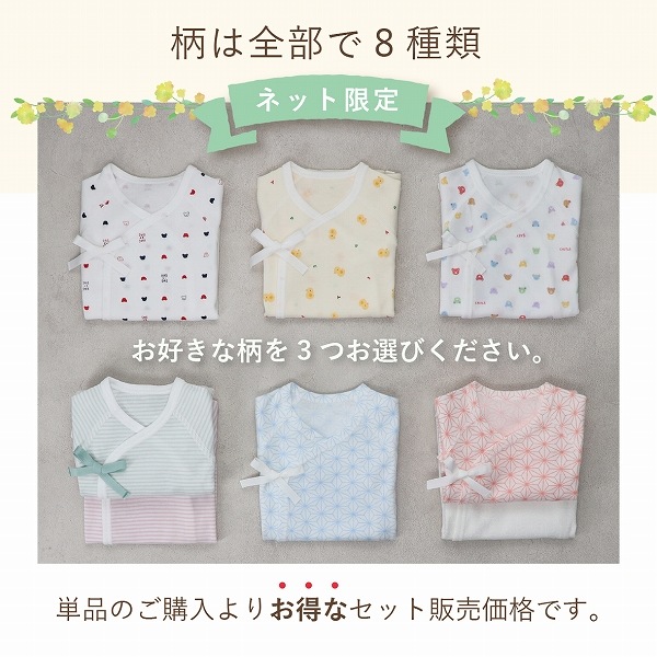 | 選べる短肌着 3枚:綿100%(フライス) *柄を3つお選びください。 |