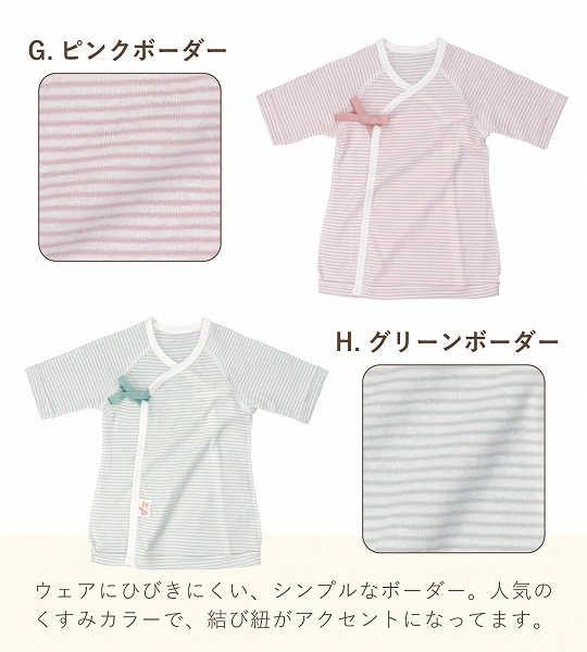 短肌着3枚をお好きな柄からお選びいただけます。単品で買うよりお得なセット価格。 オールシーズンお使い頂けるフライス素材は伸縮性があり、肌にフィットして汗をよく吸収します。 こだわりポイント1: 繰り返しお洗濯しても型崩れしにくい衿のパイピング。縦地に裁断することで、洗濯伸びしにくくしています こだわりポイント2: デリケートな赤ちゃんの肌に刺激を与えないように縫い目は平面縫製を採用。 袖口の折り返しは外側に来るよう設計しています。 こだわりポイント3: 脇の縫い代や、品質表示、タグなどは全て直接赤ちゃんの肌に当たらないように外側にしています。 こだわりポイント4: ねじれが少ない紐を使用しており、ひも先はほつれないよう補強縫いをしています。何度お洗濯しても着心地が変わりません。 |