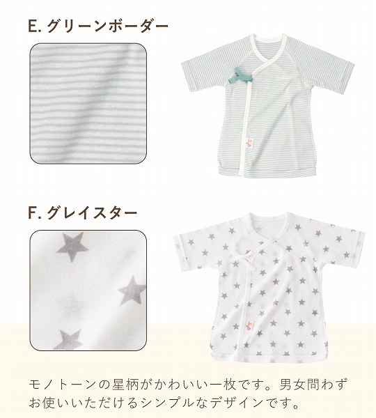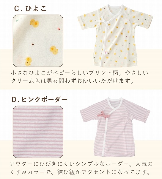 短肌着5枚をお好きな柄からお選びいただけます。単品で買うよりお得なセット価格。 オールシーズンお使い頂けるフライス素材は伸縮性があり、肌にフィットして汗をよく吸収します。 こだわりポイント1: 繰り返しお洗濯しても型崩れしにくい衿のパイピング。縦地に裁断することで、洗濯伸びしにくくしています こだわりポイント2: デリケートな赤ちゃんの肌に刺激を与えないように縫い目は平面縫製を採用。 袖口の折り返しは外側に来るよう設計しています。 こだわりポイント3: 脇の縫い代や、品質表示、タグなどは全て直接赤ちゃんの肌に当たらないように外側にしています。 こだわりポイント4: ねじれが少ない紐を使用しており、ひも先はほつれないよう補強縫いをしています。何度お洗濯しても着心地が変わりません。 |
