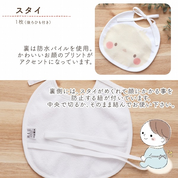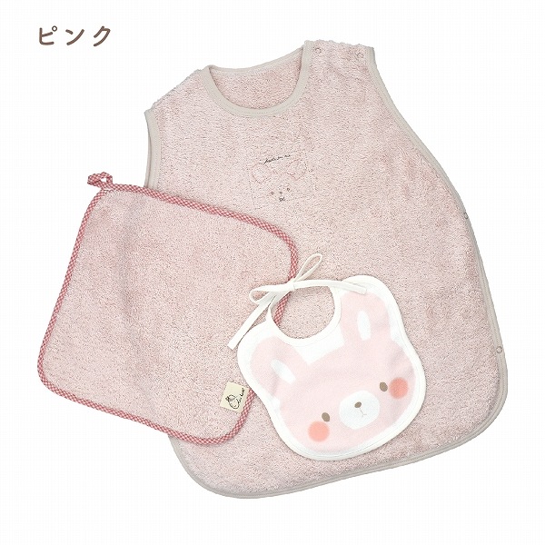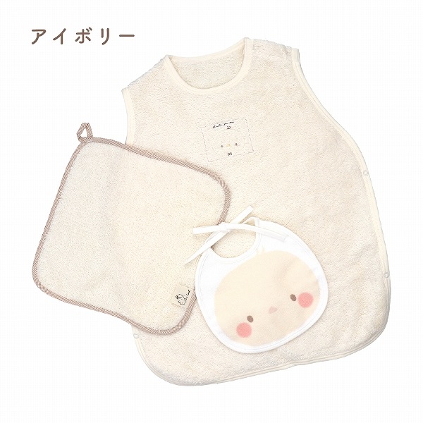 | たっぷり空気を含んでやわらかな「エアーかおるタオル」素材を使用。実用的なスリーパーやハンカチに、かわいいプリントのスタイが入っています。ベビーには珍しいくすみカラーを使用しており、やさしい使い心地で人気の高いセットです。 【スリーパー】 ねんねのときにおなかが出ないスリーパーは1着持っていると便利なアイテム。実用的で喜ばれる3点セットです。 【スタイ】 大きな顔が可愛いスタイは安心の防水機能付きです。裏側には紐が付いており、スタイがめくれて顔にかかることを防ぎます。そのまま結ぶか切ってお使いください。 不要な場合は、そのひもごと切っていただいても構いません。赤ちゃんのことを考えた、こだわりポイントです。 ピンクはうさぎ、アイボリーはひよこ、グレーはくまがモチーフになっています。 【ループ付きハンカチ】 エアーかおるのボリュームのあるタオル地は吸水性ばっちり。ループが付いているのでいろんな場所で活躍します。長く使えるのでギフトに最適です。 |