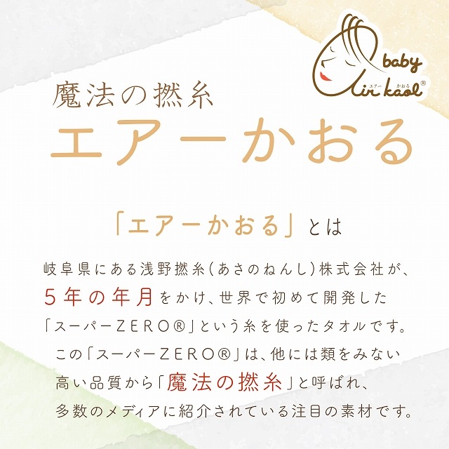 | スリーパー:綿100%(エアーかおるタオル:0~2才) スタイ:綿100%裏綿80%ポリエステル20% 中ポリウレタンラミネート ハンカチ:綿100%(エアーかおるタオル:26X26cm) |