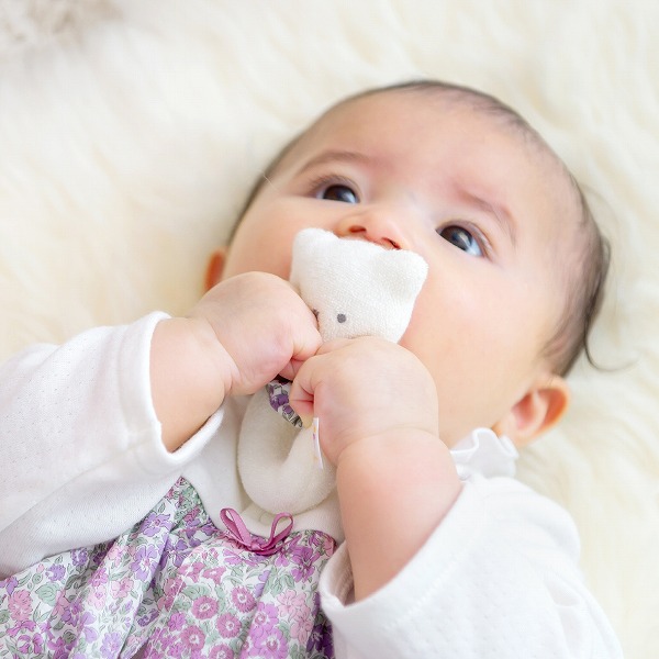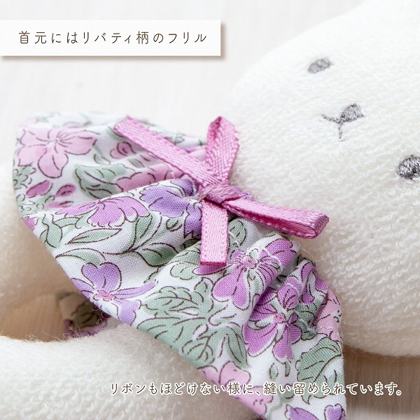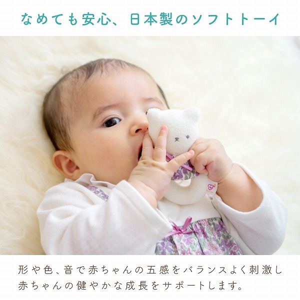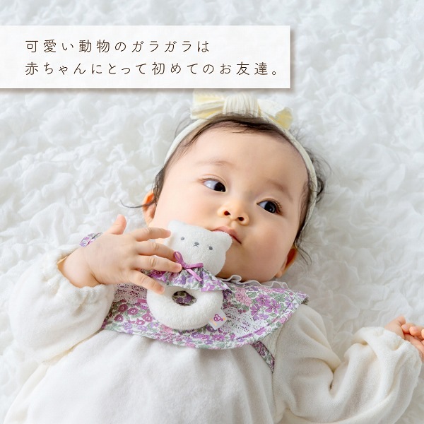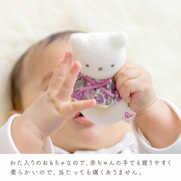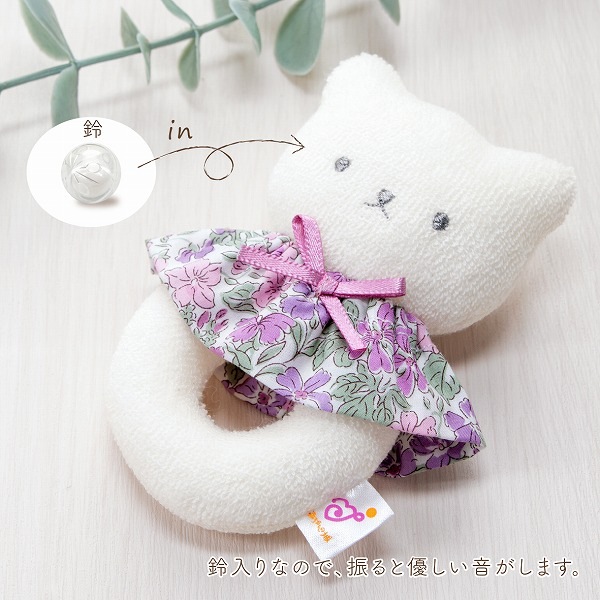 振ると鈴の音がするやわらかい布製のガラガラです。 お洗濯は軽く手洗いをして、よく乾燥をさせてください。 安全の為、破損変形している場合は使用しないでください。
