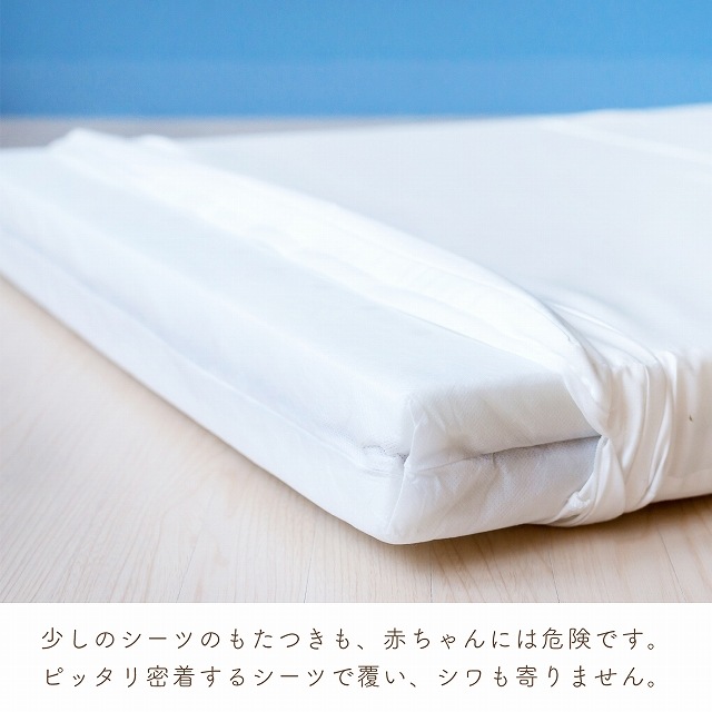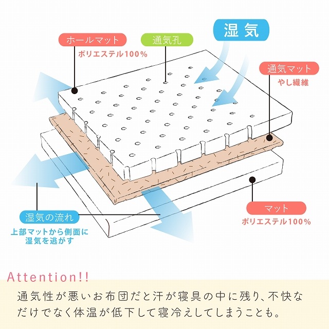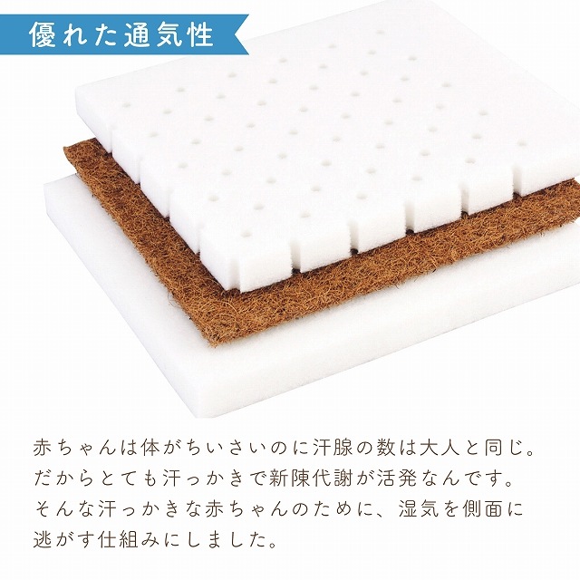 | <ポイント1> 適度な固さ ・赤ちゃんの背骨はおなかの中ではゆるやかなCの字になっています。 生まれてきて初めて平らなところで寝ます。 その時、もしお布団がやわらかいと赤ちゃんのおしりや背骨が沈み込んで深いCの字になり、不自然な状態になります。 だから、赤ちゃんの敷布団は適度な固さが必要と言われています。 <ポイント2> 優れた通気性 ・赤ちゃんはとても汗っかき。 大人の2倍以上の汗をかくとも言われています。 赤ちゃんの城が独自開発した「エコホールサンドマット」は通気性に優れた三層構造の敷布団。 敷布団の赤ちゃんが触れる面にたくさんの通気口がありそこから、湿気をすって横から逃がす構造になっています。 【お手入れ方法】 ・敷布団の側 洗濯後の縮みにより中身が装着しにくくなりますので、できるだけ洗われないようにしてください。 どうしても水洗いが必要な時は、ファスナーを閉じて洗濯ネットに入れ、他の洗濯物にからまないようにして洗ってください。 洗濯後若干の縮みがありますので、中身を入れるときに多少の力が必要になります。 干す前にたて、よこ方向ともよく伸ばしておくと縮みが少なくなります。 ・敷布団の中身 敷きふとんの中身は、通気マットの材料であるパームの繊維が折れますので、洗濯はお避け下さい。 できるだけキルトパッド、防水シーツを敷いて、中身が汚れないようにご使用ください。 もし、汚れた場合はその部分だけタオルなどに水を含ませ汚れを吸い取ってください。 |