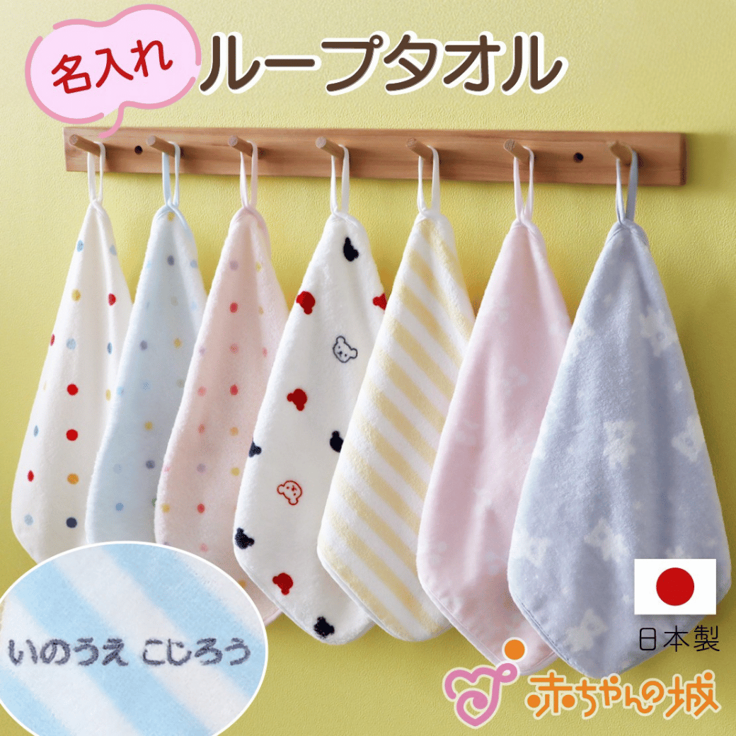 | 今治製と泉州製のハンドタオルは、ふわふわの肌触りが気持ちよく吸水性も抜群です。お好きな柄をお選びいただけます。 吊り下げるときに便利なループ付き。お名前が書けるワッペンが付いているので、お友達のタオルと間違える心配がありません。 洗い替えに便利な買うほどお得なセットは送料無料で名入れも無料。入園、入学準備におすすめです。 |
