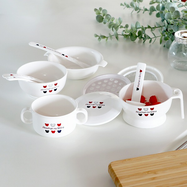 | 赤ちゃん用食器と離乳食調理グッズセットです。お茶碗やスプーン、両手コップなど毎日使える食器に加え、すり鉢やおろし器、こし網などの調理器具が揃っています。こし網以外は食洗機にもお使いいただけます。白い食器に赤紺の小さなくまさん柄がポイント。すっきりとしたデザインで男女問わず人気の商品です。 |
