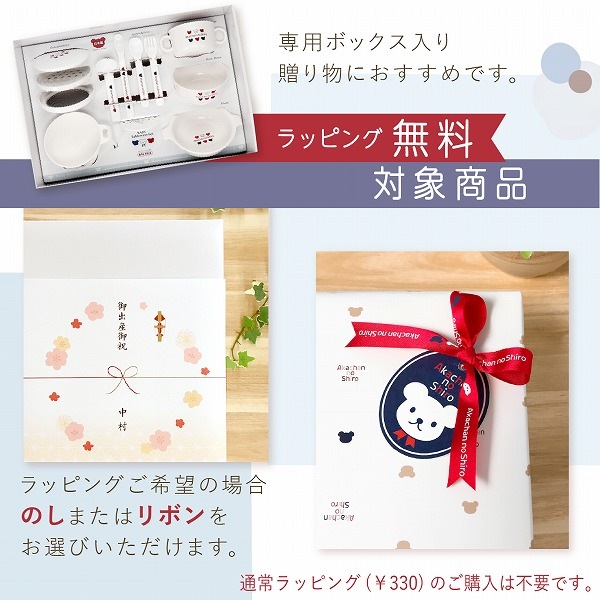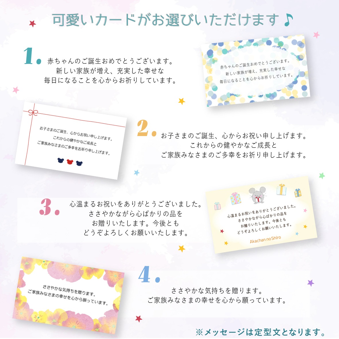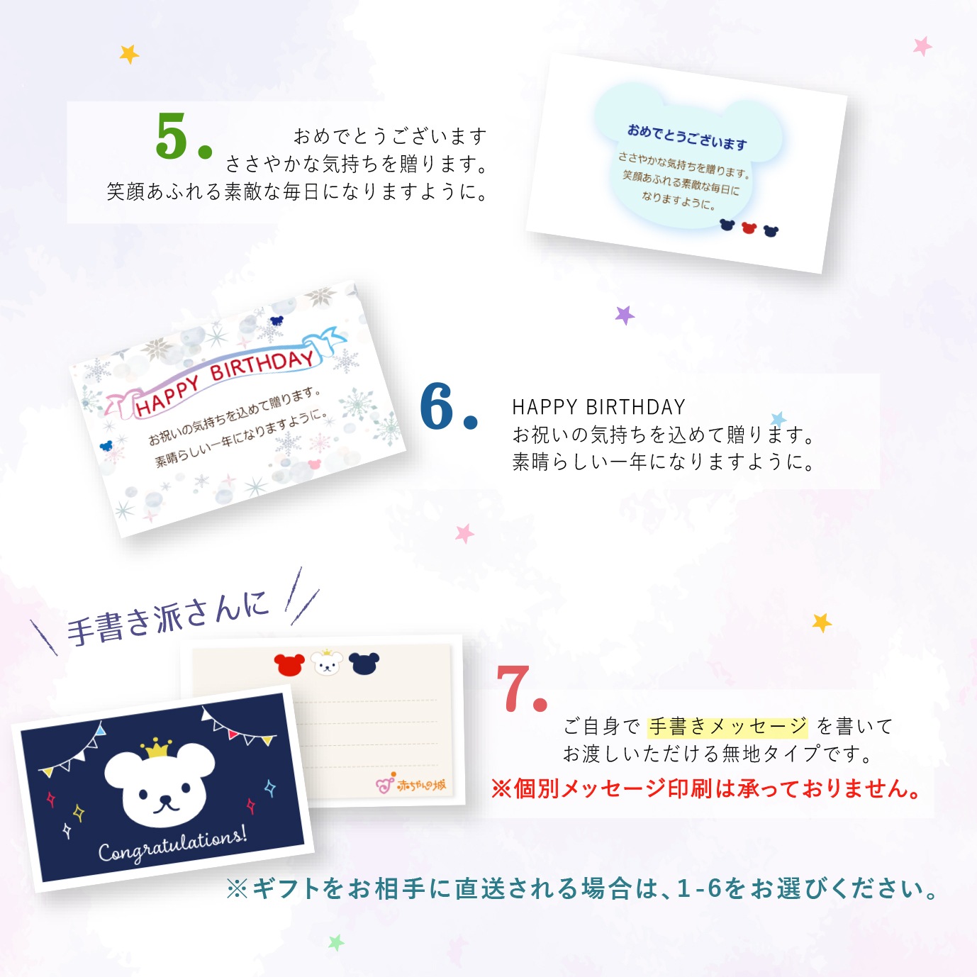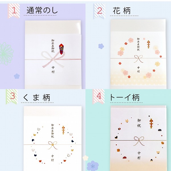 ●ラッピングの種類 ・のし掛け(通常のし/くま柄/花柄/トーイ柄) ・リボン包装 ・包装紙のみ ●メッセージカード お好きなメッセージカードをつけることができます。 ●手提げ袋 手提げ袋の有無を選ぶことができます。 【のし掛けをご希望のお客様へ】 のしの表書き、のしを送る方のお名前を必ずお選びください。 |