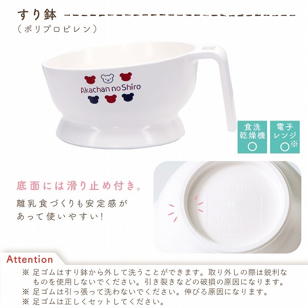 ・BPA(ビスフェノールA)フリー ・BPS(ビスフェノールS)フリー 茶碗(ポリプロピレン)・ファーストプレート(ポリプロピレン)・ふた(ポリプロピレン) すり鉢(ポリプロピレン)・蒸しプレート(ポリプロピレン・両手コップすり鉢(ポリプロピレン)) すりつぶしスプーンポリプロピレン)・おろし器(AS樹脂) こし網(ポリプロピレン・ステンレス) スプーン&フォーク(ポリプロピレン) フィーディングスプーン(ポリプロピレン) |
