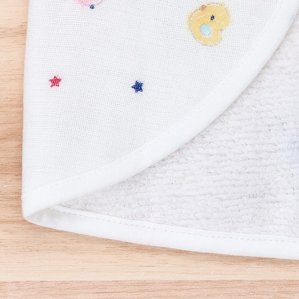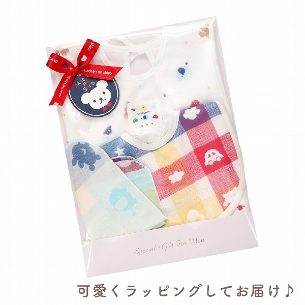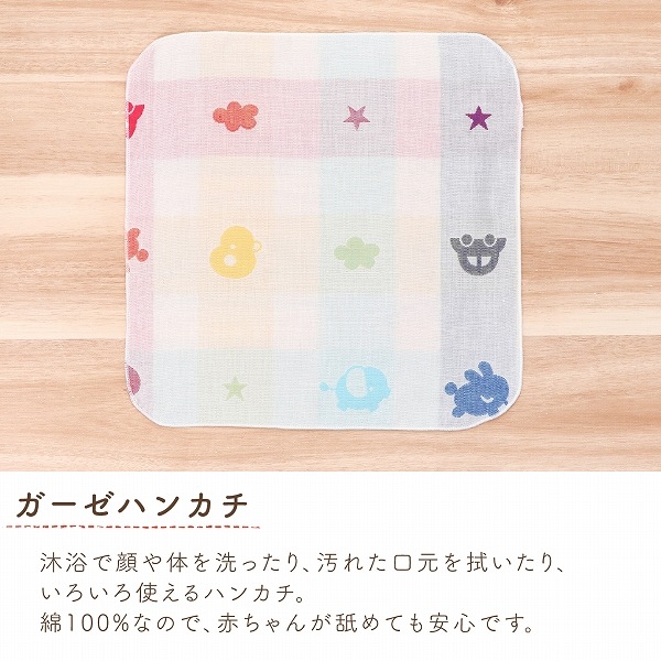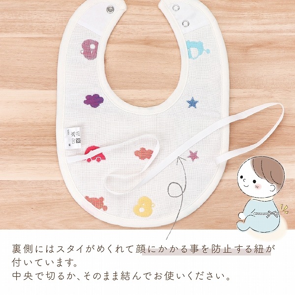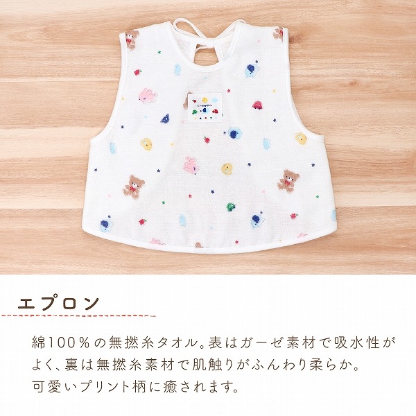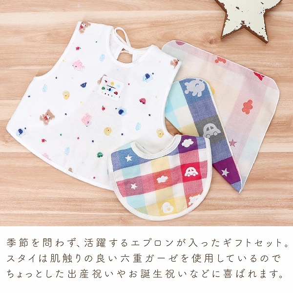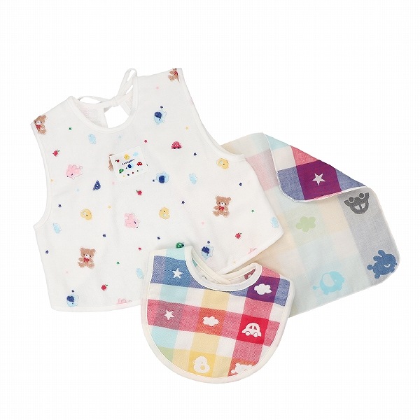 【エプロン】表はガーゼ、裏は無撚糸タオルを使用したエプロンです。離乳食などの際に、お洋服が汚れるのを防いでくれます。パステルクレヨンで書いたようなかわいらしいデザインが人気です。 【スタイ】吸水性の高い6重ガーゼを使用したスタイです。スタイの裏側には、スタイがめくれて顔にかかることを防止するひもがついています。そのまま結んだり、切って使ったり。不要な場合は、そのひもごと切っていただいても構いません。赤ちゃんのことを考えた、こだわりポイントです。 【ハンカチ】沐浴の際に、授乳の時に、お食事の時にさっと使えるガーゼハンカチです。二重ガーゼを使用しているので、使うほどに柔らかくなります。 |